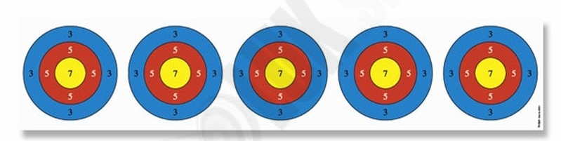 5 terčov redukované na halovú streľbu na cca 12-14 m zo spevneného podšívaného papiera určeného pre reflexné luky, keď strelec nemá k dispozícii vzdialenosť 18m a terč je tak proporčne zmenšený na menšiu strieľanú vzdialenosť, pritom opticky to vyzerá, že strieľa práve 18 m. Možné ho použiť aj na kuše. Počet 5 ks v cene 1,99 Eur.