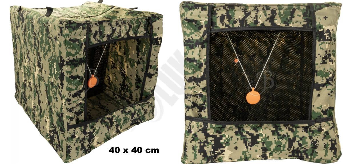 Sieť na zachytávanie guľôčok do praku Blackbird box, s ktorým sa dá trénovať streľba z praku a zároveň opakovane využívať muníca.V strede je terčík, lapač guľôčok zachytí aj rýchle praky.Vhodné pre oceľové guľôčky, sklené guľočky aj hlinené guľôčky do praku.